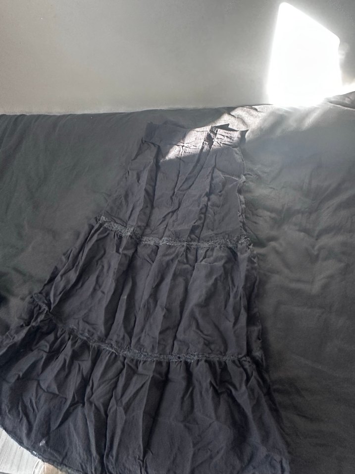 siyah , keten kumaştan yapılmış, volan detaylı ve bol kesim uzun etek. Gotik ve avant-garde tarzda, açık hava için uygundur. Ütüsüsz oldugu için biraz kırış ama duruşu üstte iyi duruyor bana küçük geldi 2 kez giydim zateb