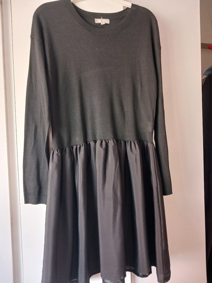 Bu kadın midi elbise, uzun kollu ve yuvarlak yakalıdır. Salaş kesimi ve pileli etek kısmı ile yumuşak sentetik kumaştan üretilmiştir.