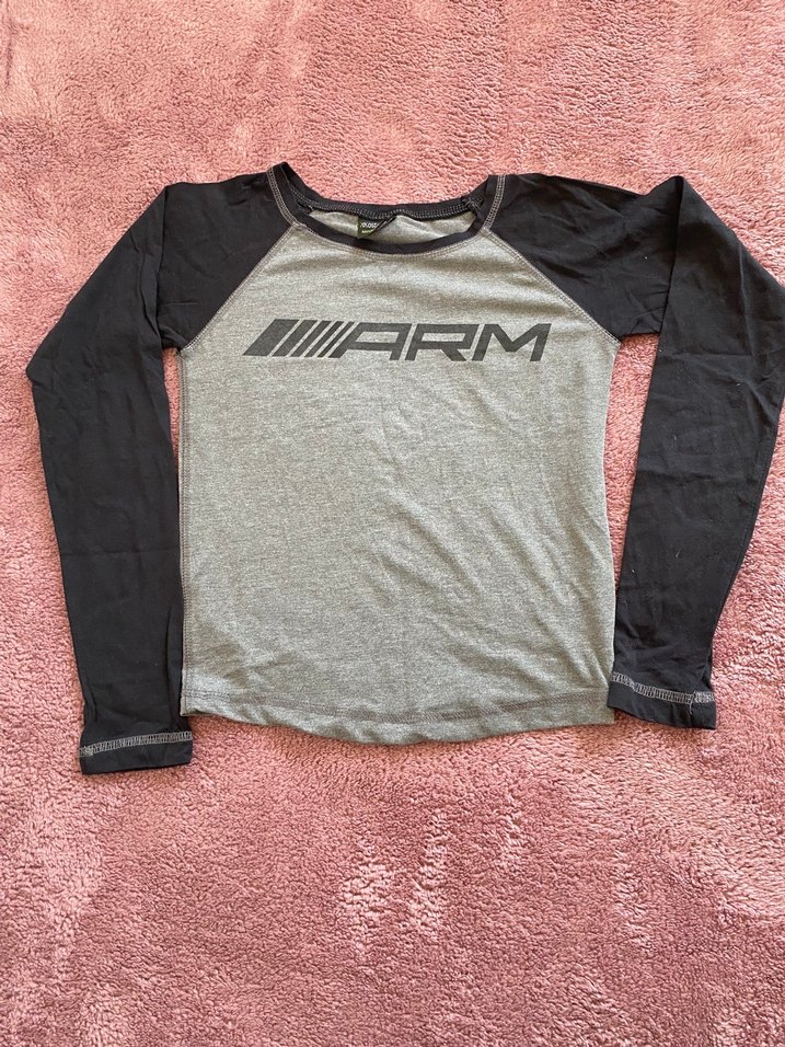 Bu dar kesim tişörtü, uzun siyah kollara ve önünde ARM baskılı gri gövdeye sahiptir. Bisiklet yaka ve cırt cırt detaylı, rahat pamuklu kumaştan yapılmıştır. ♀️