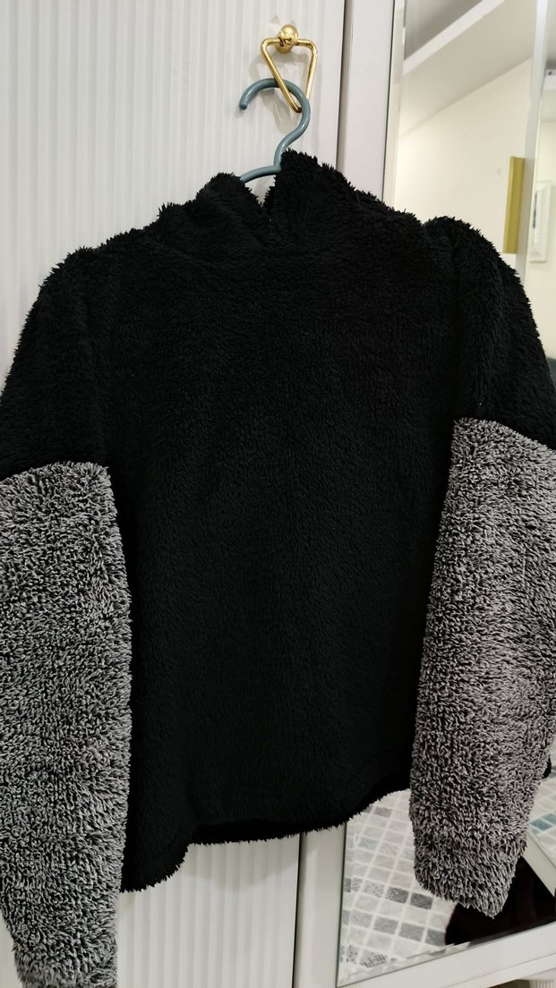 gri ve siyah renklerde, uzun kollu ve yuvarlak yakalı peluş sweatshirt. Rahat ve bol kesimiyle günlük kullanıma uygundur. 55cm boyu