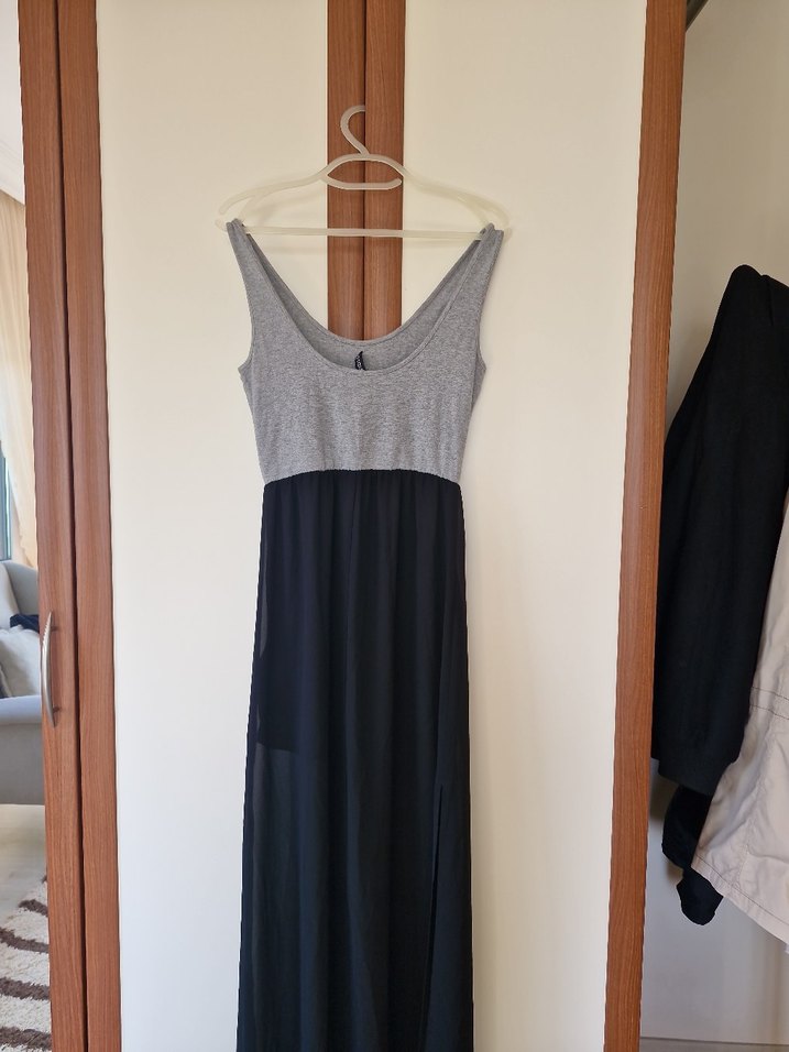 Gri üst kısmı ve siyah eteğiyle, kolsuz, straplez, drapeli uzun ve için mini etek üstü bilek boy şifon elbisedir. Günlük kullanıma uygundur.