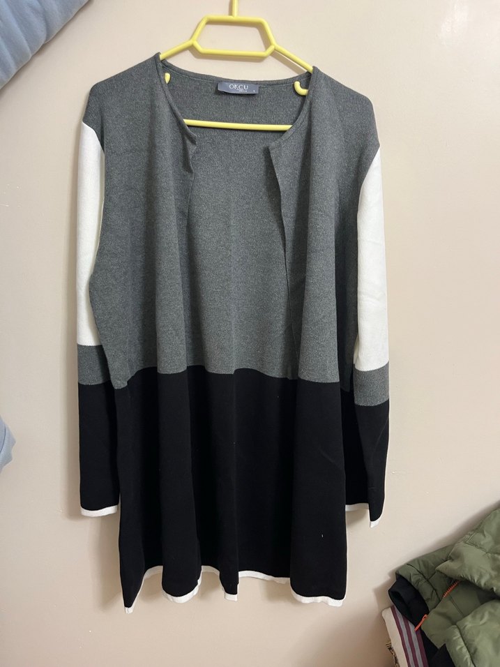 Mağazamızı kapatıyoruz.Elimizdeki son ürünleri satıyoruz. Yeni ve kullanılmamıştır. Kadın hırka, uzun kollu ve yuvarlak yakalıdır. Gri ve siyah renk bloklu, örgü triko kumaştan yapılmıştır. Günlük kullanıma uygundur.