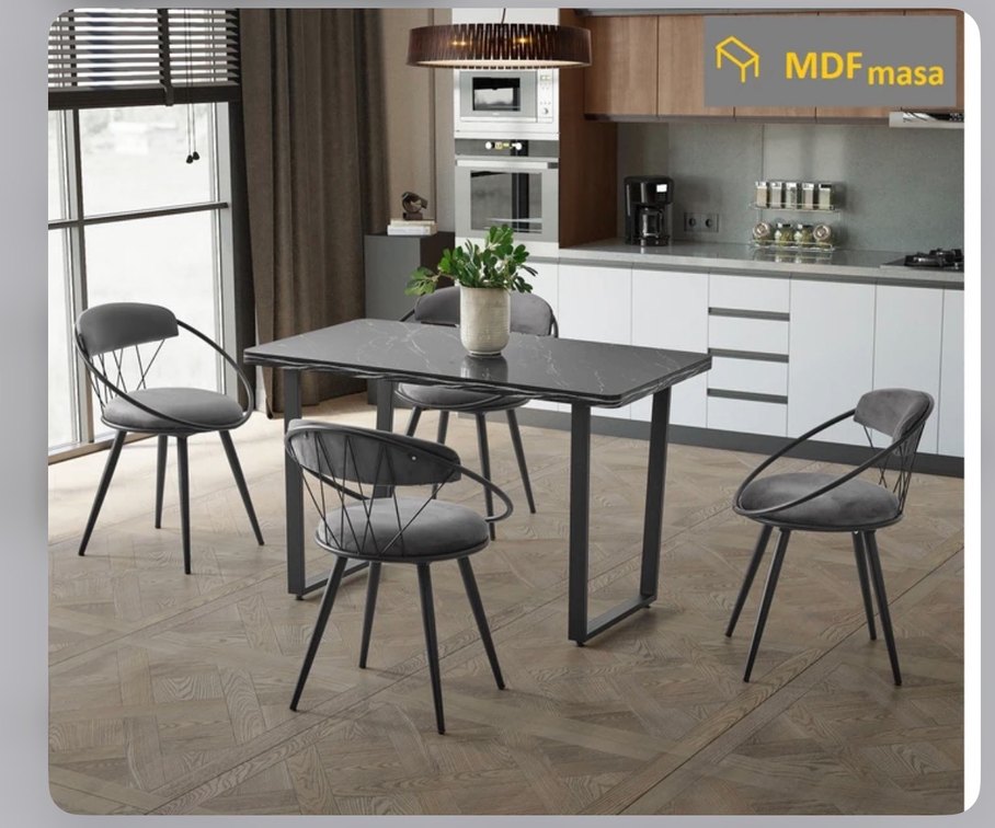 Gri ve siyah renklerde, desen içermeyen, çağdaş tarzda yemek masası seti. Modern yemek alanları için uygundur. 120x70 ölçülerinde yeni sadece 6 ay kullanıldı vivenseden alındı