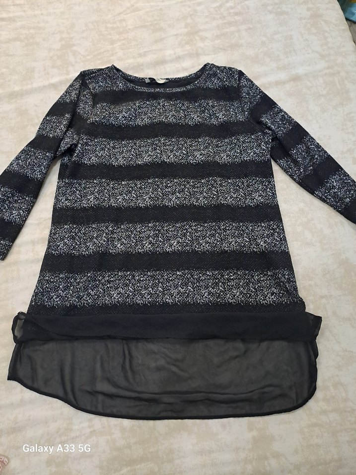 Siyah ve gri zebra desenli triko elbise, uzun kollu, yuvarlak yaka ve bol kesimlidir. etegi tül detayı ve şeffaf etek ucu bulunur. Yumuşak sentetik kumaştan üretilmiştir. iki kol arası 49 cm,omuzdan asagı 73 cm