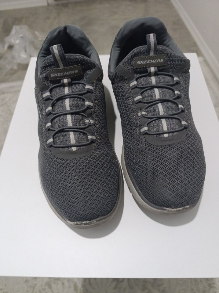 Gri Skechers erkek spor ayakkabısı, lastikli bağcık ve kauçuk tabanlıdır. Spor ve günlük sokak stiline uygundur, rahat ve esnektir.