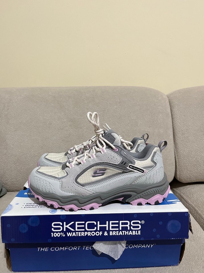 Platform topuklu, elastik detaylı gri Skechers kadın spor ayakkabısı. Su geçirmez ve nefes alabilen kauçuk malzemeden üretilmiştir. ♀️