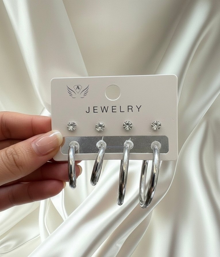 Gri SMini Halka ve Taşlı Küpe Seti