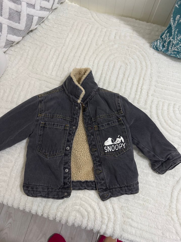Gri renk, bol kesim erkek çocuk kot ceket. Kürklü iç detay ve göğüste SNOOPY baskısı bulunur. Sokak modasına uygun rahat bir model. 2 kere kullanıldı hiçbir sorunu yoktur
