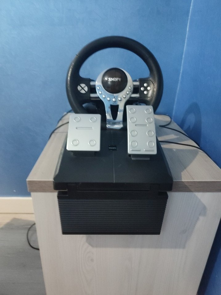 Snopy marka koyu gri renkli oyun direksiyonu ve pedalları, sürüş oyunları için uygun bir settir.