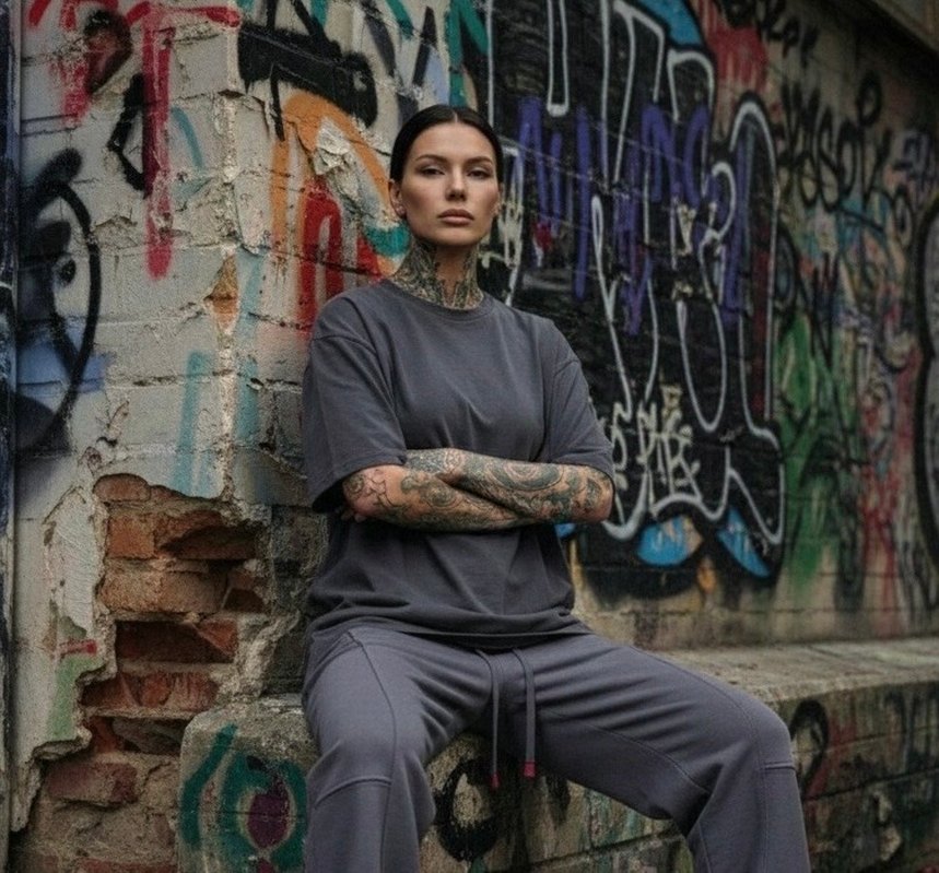 Gri denimden, yüksek yakalı ve kısa kollu, rahat kesimli kadın streetwear tişört günlük kullanım için zahmetsiz şıklık sunar.