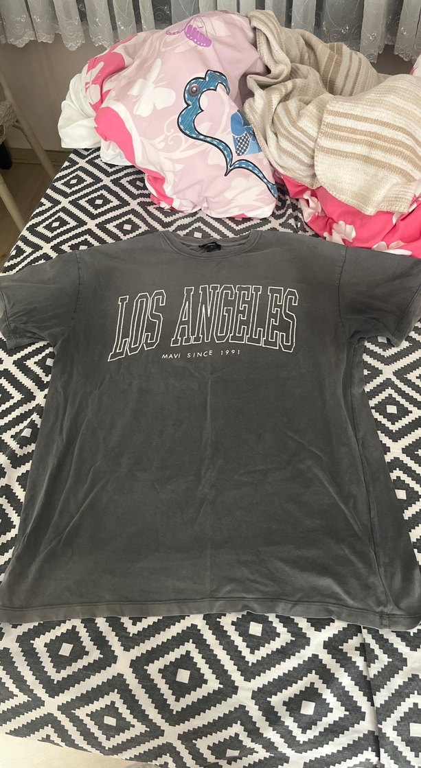 Gri renkte, kısa kollu, bol kesim kız çocuk tişörtü. 'LOS ANGELES' baskılı, yuvarlak yaka ve rock punk tarzını yansıtan bir tasarıma sahip.yakasında ufak bir çizik defosu var ama belli belirsiz beden one size