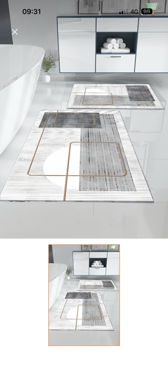 Geometrik şekiller ve ince çizgilerle gri tonlarda soyut desenlere sahip çağdaş banyo paspası, modern bir dokunuş sağlar.
