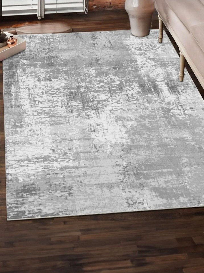 Gri tonlarında soyut desenli çağdaş halı, modern iç mekanlara uyum sağlar ve mekana hafif dokulu bir görünüm katar. süngerli kaymaz taban