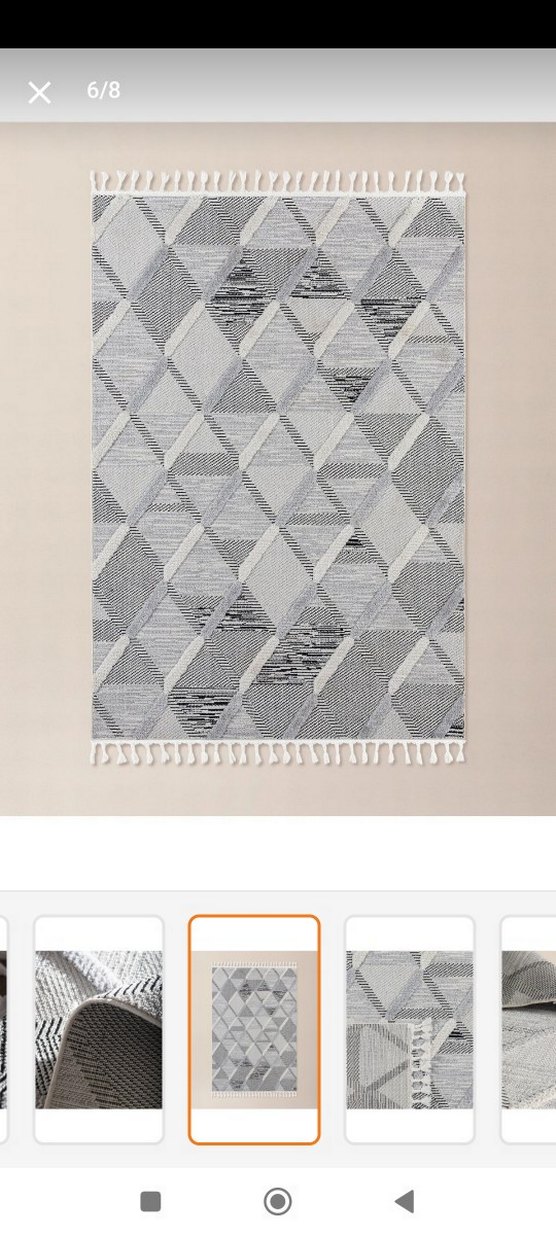 Bu modern halı, farklı gri tonlarında soyut geometrik desenlere sahip olup, kenarlarında beyaz püsküller bulunur. 6 metre
