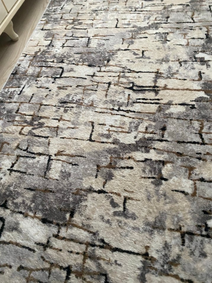 Gri tonlarında soyut desenli bu modern halı, mekana şık ve çağdaş bir dokunuş katar. Yumuşak dokusuyla konfor sağlar. Kesme halidir 2 adet fiyatıdır en 100 cm boy uzunluk 200 cm dir