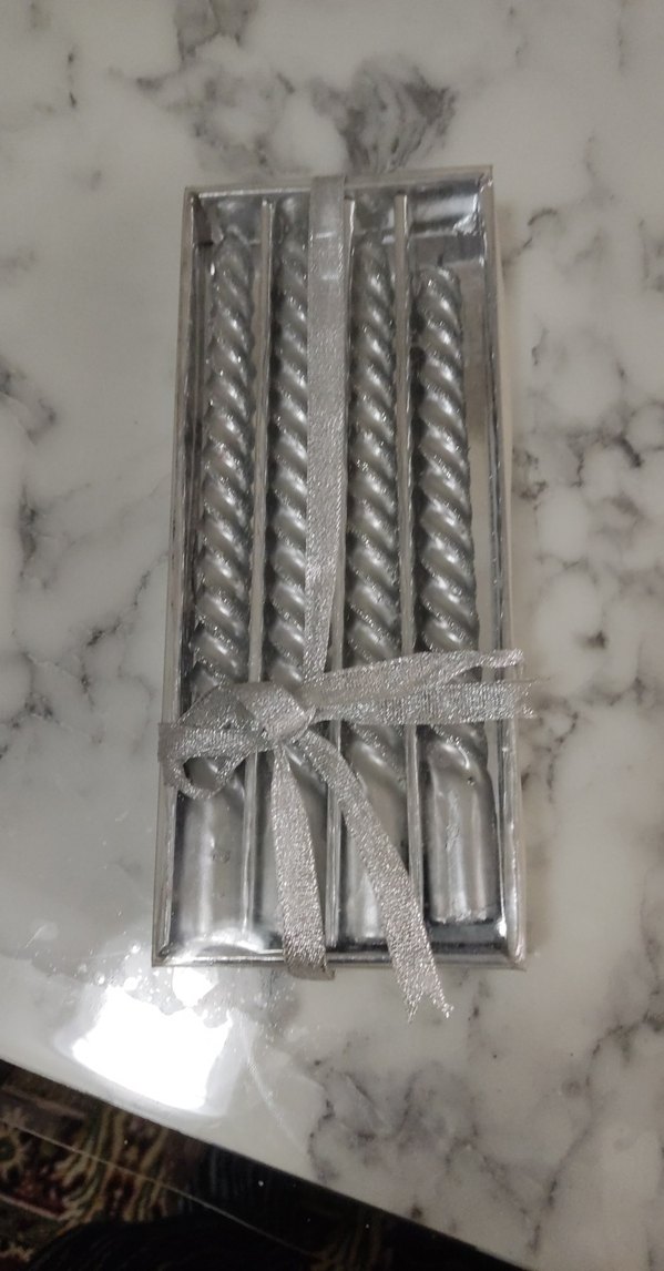 Dört adet gri spiral mum, uyumlu kurdele ile bağlanmış, şık dekorasyon için uygundur. ️