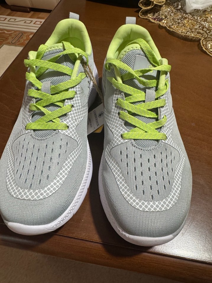 Gri renkli, bağcıklı ve kauçuk tabanlı kadın spor ayakkabısı. Çağdaş stiletto topuklu ve desensiz model, spor ve athleisure için uygundur. Etiketlidir