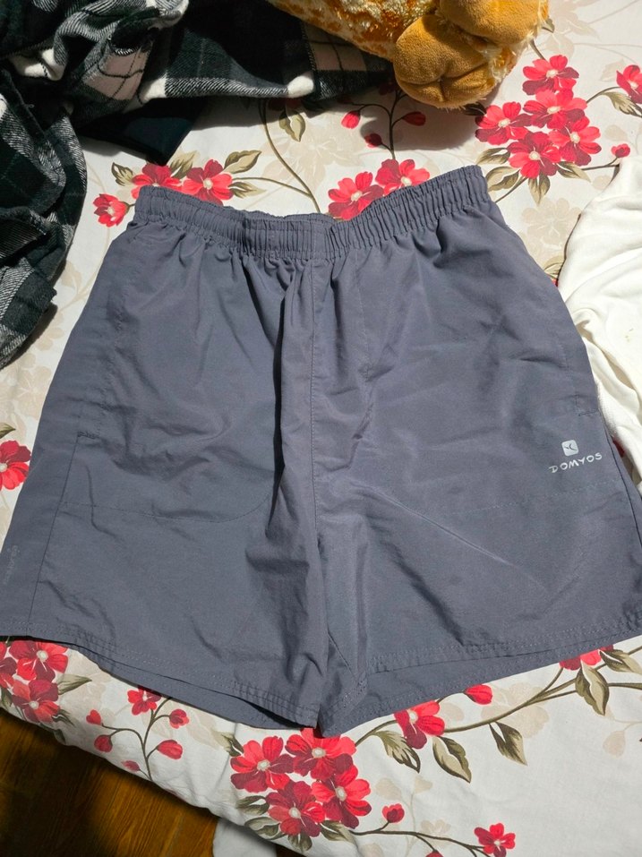 Gri renk, sentetik kumaştan yapılmış elastik bel bantlı, bol kesim kadın şort. Sade ve desensiz tasarım.1-2 defa giyilmiştir