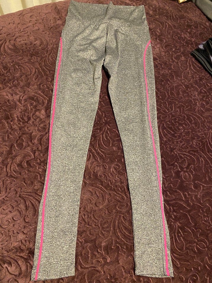 Gri renkli, pembe yan şeritli, elastik bel bantlı, yumuşak sentetik kumaştan spor ve günlük kullanım için uygun, normal boyda dar kesim kadın tayt. sorunu yoktur hiç giyilmedi
