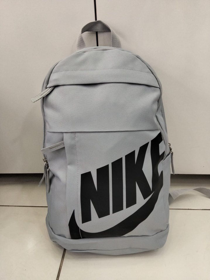 Gri renkli, Nike baskılı ve fermuarlı cepleri olan spor sırt çantası. Sokak stiline uygun, trend günlük kullanım için ideal.