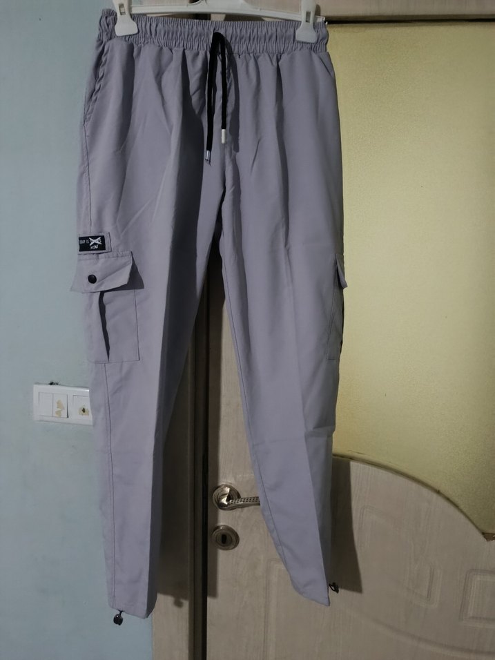 Gri renkli, bol kesim ve kemerli erkek jogger pantolon. Sentetik kumaştan, sokak modası ve athleisure tarzında, günlük kullanıma uygun.