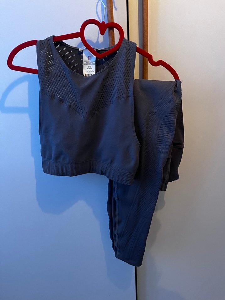 Gri renkli, sentetik kumaştan yapılmış, fit kesim tayt ve crop top takımı, cırt cırt detaylarıyla sokak modasına uygun. Hiç giyilmedi
