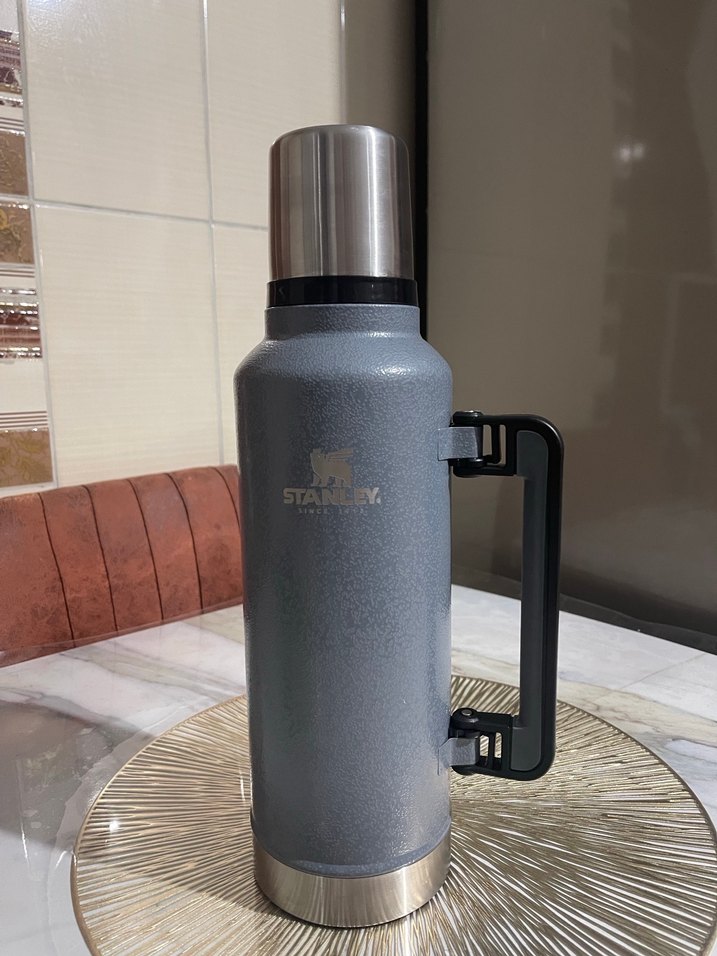 Gri Stanley termos, sağlam sap ve metal kapaklı, içecekleri sıcak tutar. ️