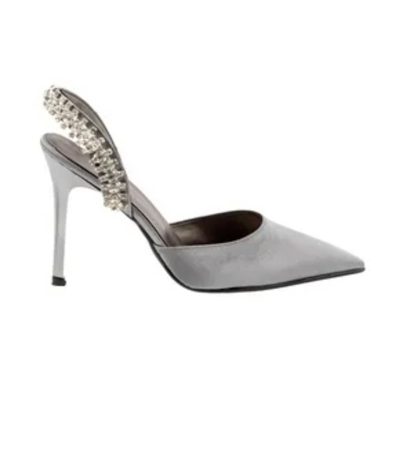 Gri stiletto topuklu, metal tokalı kayışla klasik zarafeti modern tarzla buluşturur, romantik akşamlar için ideal.