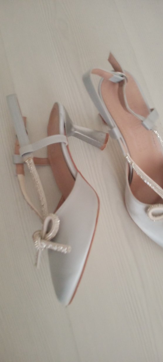 Gri stiletto topuklu, fiyonk detaylı, çağdaş tasarıma sahip ve rahat kauçuk tabanlı kadın abiye ayakkabı.