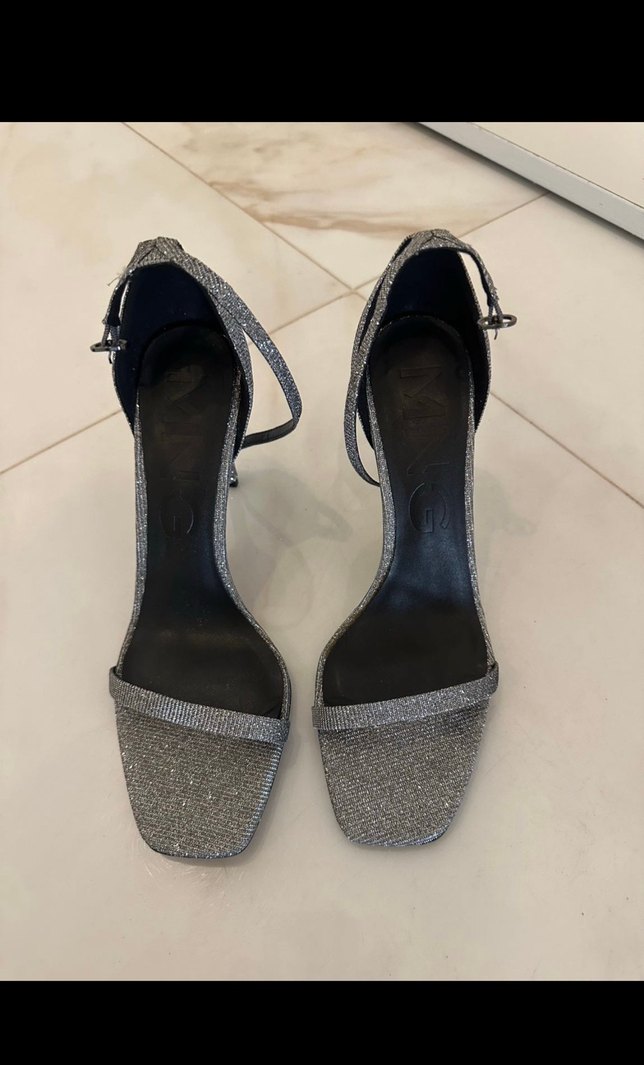 Gri yılan deseni ve tokalı bantlı, kauçuk malzemeden yapılmış stiletto topuklu ayakkabılar. Romantik akşamlar için uygundur.