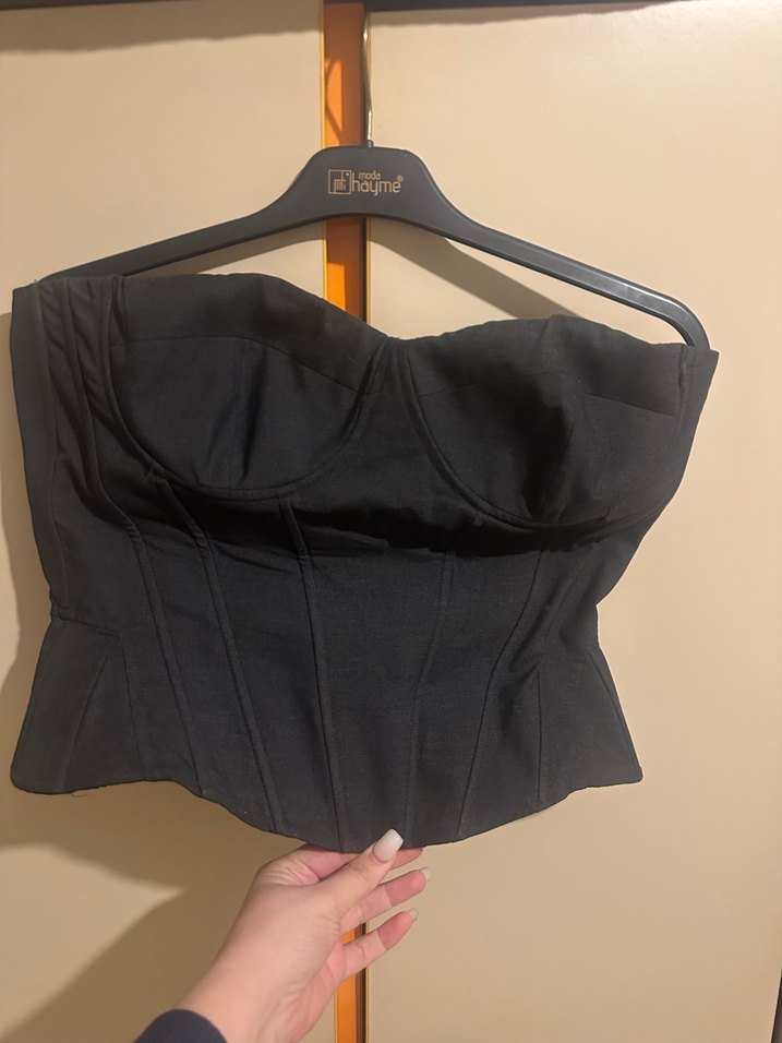 Düğmeli, askılı kollu, siyah straplez gotik stilinde, vücuda oturan büstiyer. Sentetik kumaştan, midi boyda, günlük kullanıma uygun.