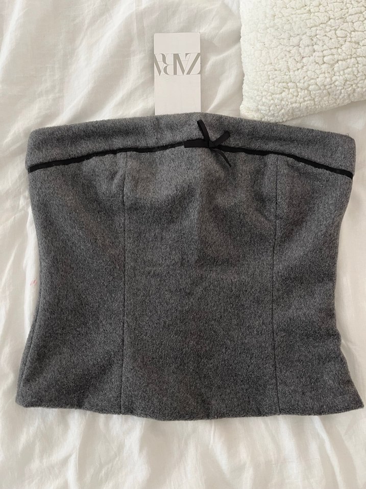 Bu gri straplez, kemerli ve vücuda oturan büstiyer, yumuşak sentetik kumaştan yapılmış, günlük kullanım için rahat ve sade bir tarza sahip.