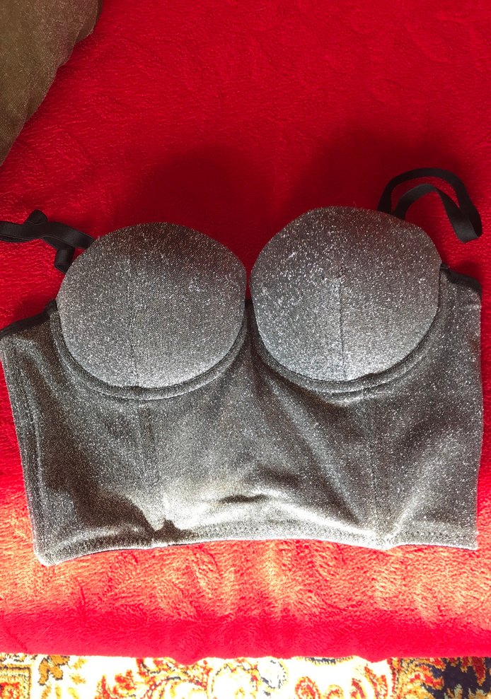 Gri renkli, straplez yaka ve askılı kısa bustiyer. Düğmeli detaylı, sentetik kumaştan, cesur ve göz alıcı parti tarzı için uygun.