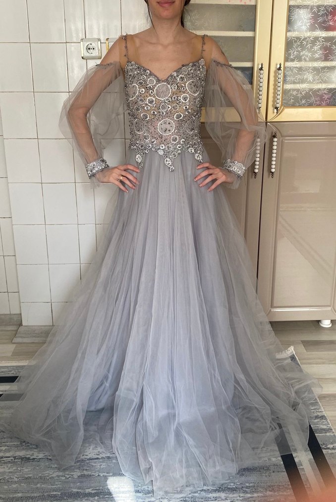 Yalnızca 1 defa giyildi. 1.72boy ve 52 kiloyum gri nişan elbisesi, straplez yaka ve işlemeli uzun şeffaf kollara sahiptir. Drapeli, bohem tarzda ve düğünlere uygundur.