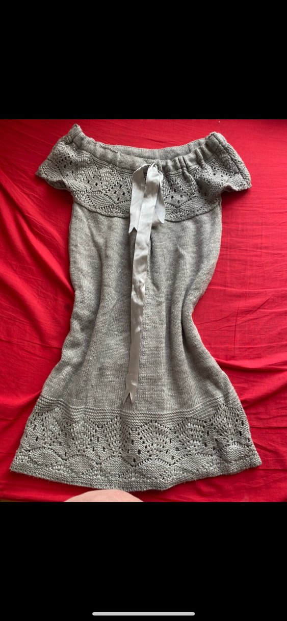 Gri örgü kumaştan, straplez ve işlemeli detaylı, beli kurdele bağlamalı, bohem tarzda kısa ve vücuda oturan elbise.
