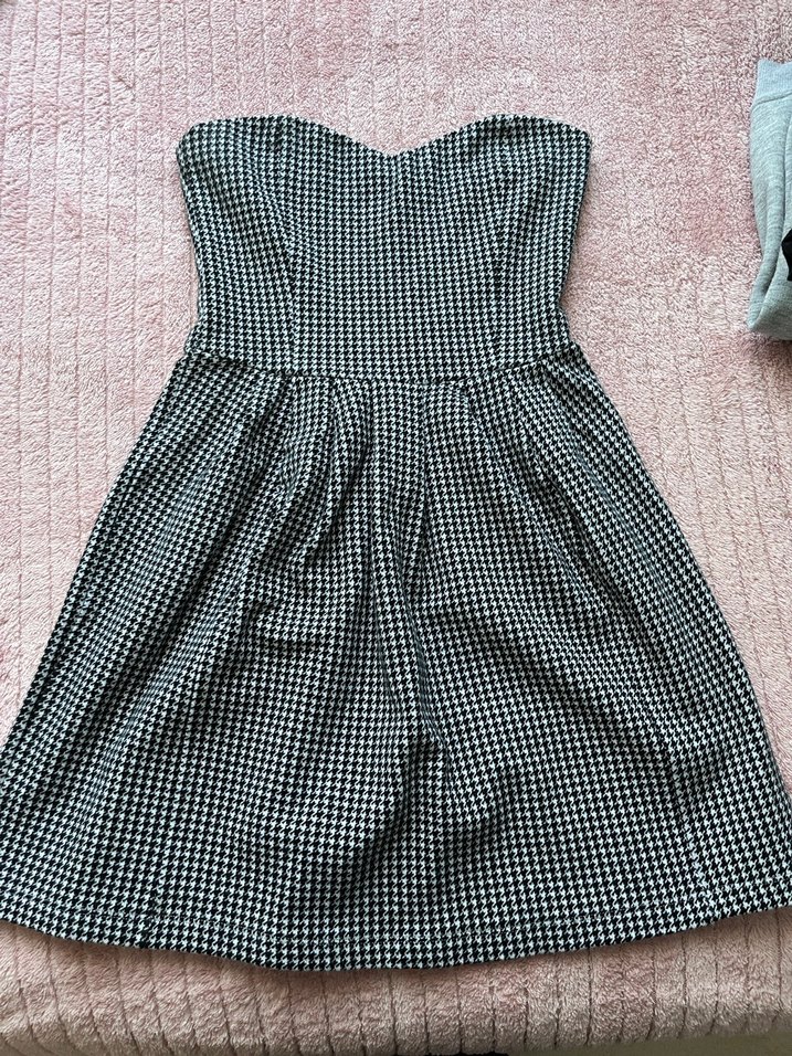 Gri kareli, straplez ve piliseli etekli, sentetik kumaştan yapılmış, midi boy ve kolsuz mini elbisedir.