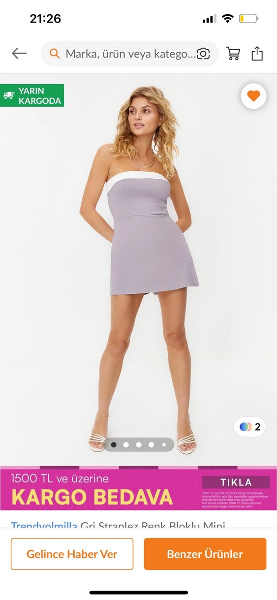 Gri/Mor arası çok ponçik bir renge sahip straplez mini tulum ama aldığım yerde gri diyor. 80C/85B sütyen bedenine sahibim. 165 cm boyunda 70 kiloyum. Latin dans gecelerinde tulum olmasından dolayı rahat ederim diye düşündüm fakat straplez olması beni biraz gerdi. Benim bedenime sahip birisinin göğüs kısmını biraz daraltması daha iyi olabilir. Daha büyük göğüslüler kesinlikle kaçırmasın.