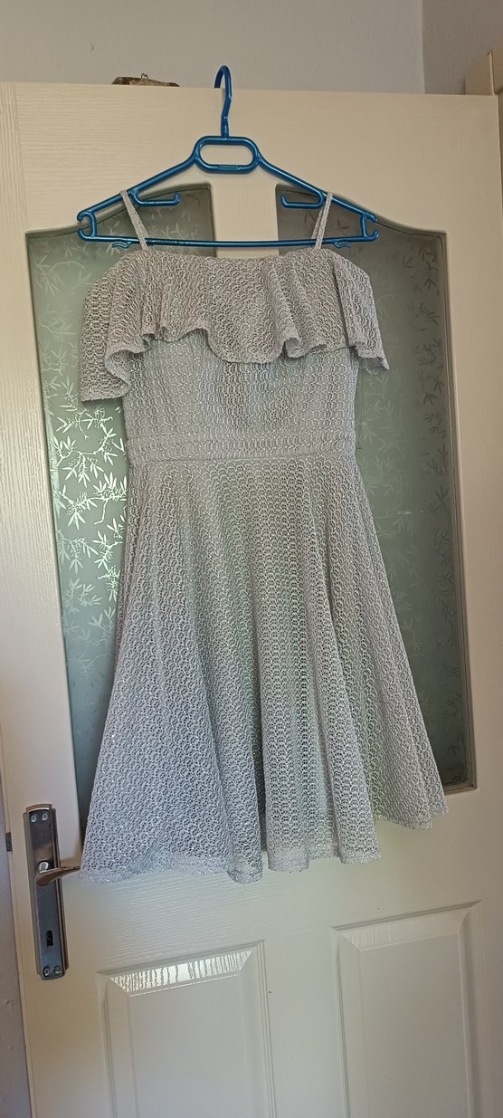Gri triko midi elbise, straplez yaka ve fırfır detayına sahip, bol kesim vintage bohem tarzında. Düğünler için uygun.