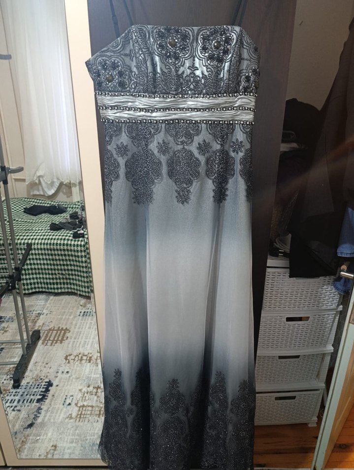 Gri Straplez Uzun Abiye Elbise