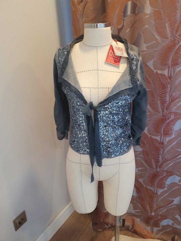 Gri renkli, straplez yaka ve uzun kollu, düğmeli denim bolero. Gotik tarzda, baskılı desene sahip, trend belirleyici kızlar için uygun.