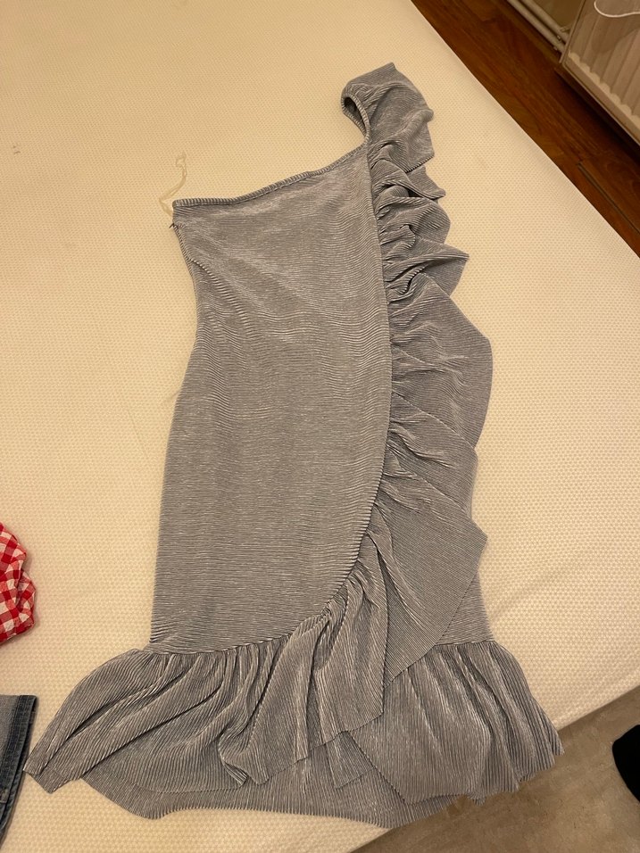 Gri renkte, straplez yakalı ve yan ile etek kısmında fırfır detaylı, uzun ve vücuda oturan bohem ve avangart tarzda elbise.