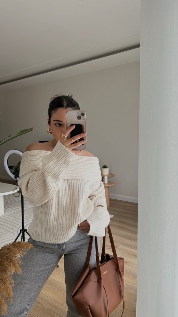 Gri renkte, straplez yakalı ve uzun kollu, rahat kesime sahip örme kazak. Midi boyuyla günlük kullanıma uygun, sade ve şık bir parça.