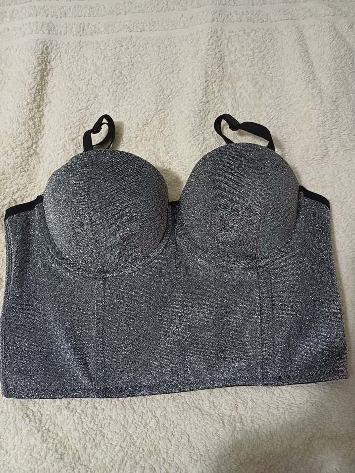 Sentetik kumaştan yapılmış, detaylı, askısız yaka ve askılı kısa kesim gri bustiyer. Günlük kullanıma uygundur.