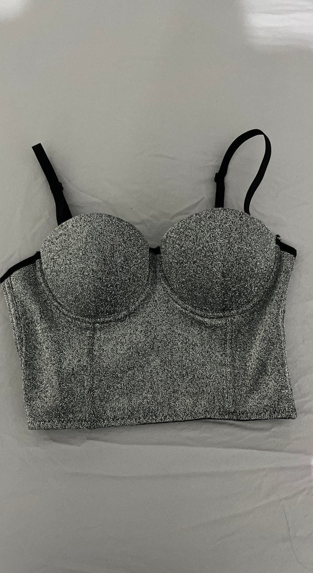 Gri renkte, sentetik kumaştan yapılmış, straplez ve strappy kollu, vücuda oturan büstiyer. Goth ve athleisure tarzını yansıtan, zahmetsiz şıklık sunar. Günlük kullanım için uygundur.