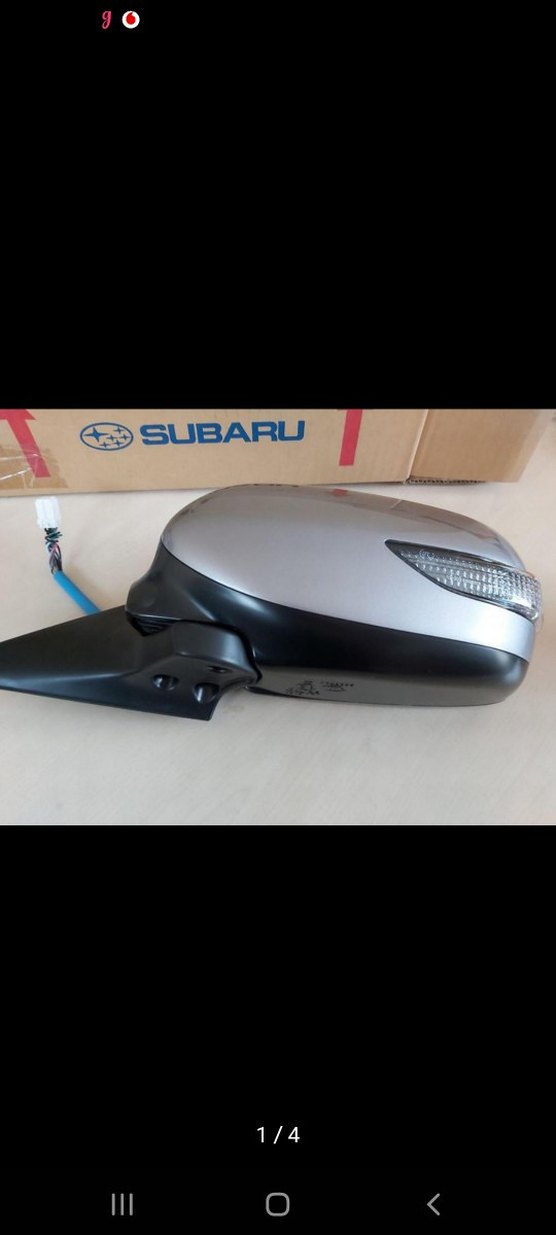 Gri Subaru araç yan aynası, entegre sinyal ışığı ile birlikte. Montaj noktaları ve bağlantı kablosu mevcuttur.