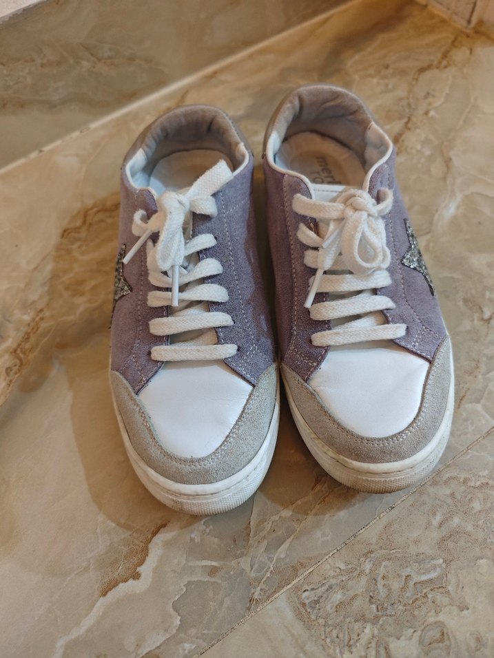 Bağcıklı, düz tabanlı gri süet kadın spor ayakkabısı, mor tonlarında, günlük ve sokak stili için uygun.