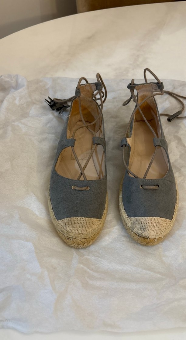 Gri süet espadriller, dolgu topuklu ve tokalı kayışlara sahiptir. Desensiz tasarımı, günlük kullanıma uygun trend ve rahat bir görünüm sunar. Derinod.Bir kere giyildi.