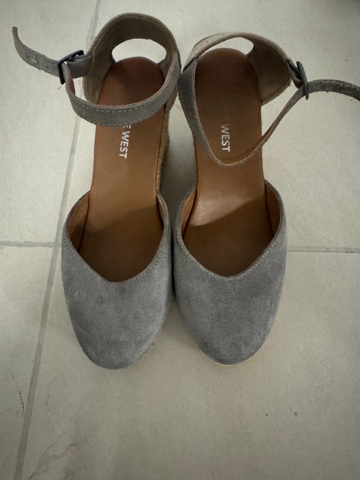 Gri süet malzemeden, tokalı bilek kayışlı dolgu topuklu kadın ayakkabısı. Minimalist ve normcore tarzda, günlük kullanıma uygun.