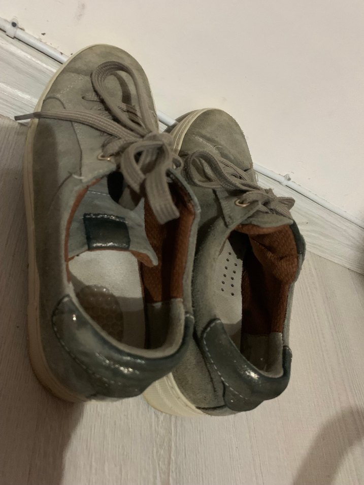 Gri süet malzemeden yapılmış, dolgu topuklu ve tokalı kadın spor ayakkabısı. Günlük sokak stili için rahat ve şık bir seçim.