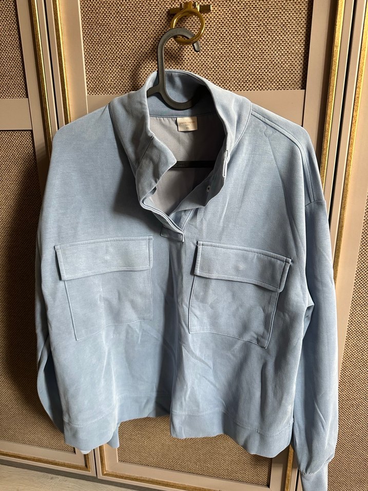 Gri süet kumaştan, düğmeli ve yakalı bu kadın ceket, bol kesim ve uzun kolludur. Normal midi boyunda, günlük rahat sokak stili için uygundur.